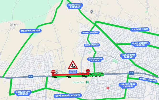 Transit geçiş yapacak araçlar için Hısnı Mansur Caddesi, Üçüncü Çevre Yolu, Karapınar Caddesi ve Mersin Caddesi.